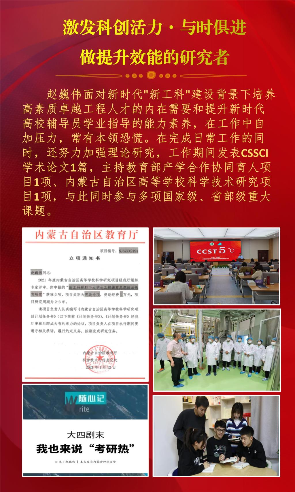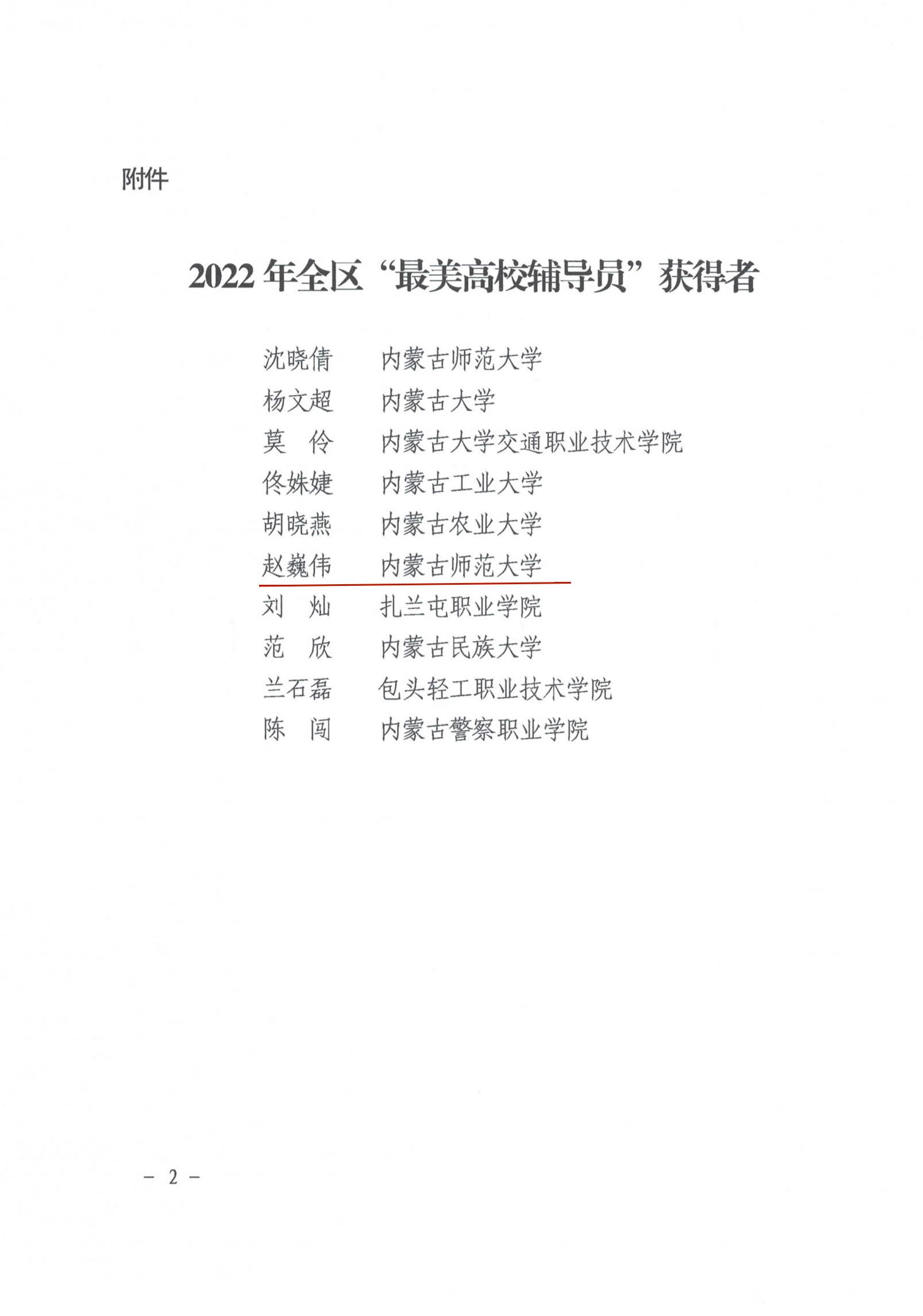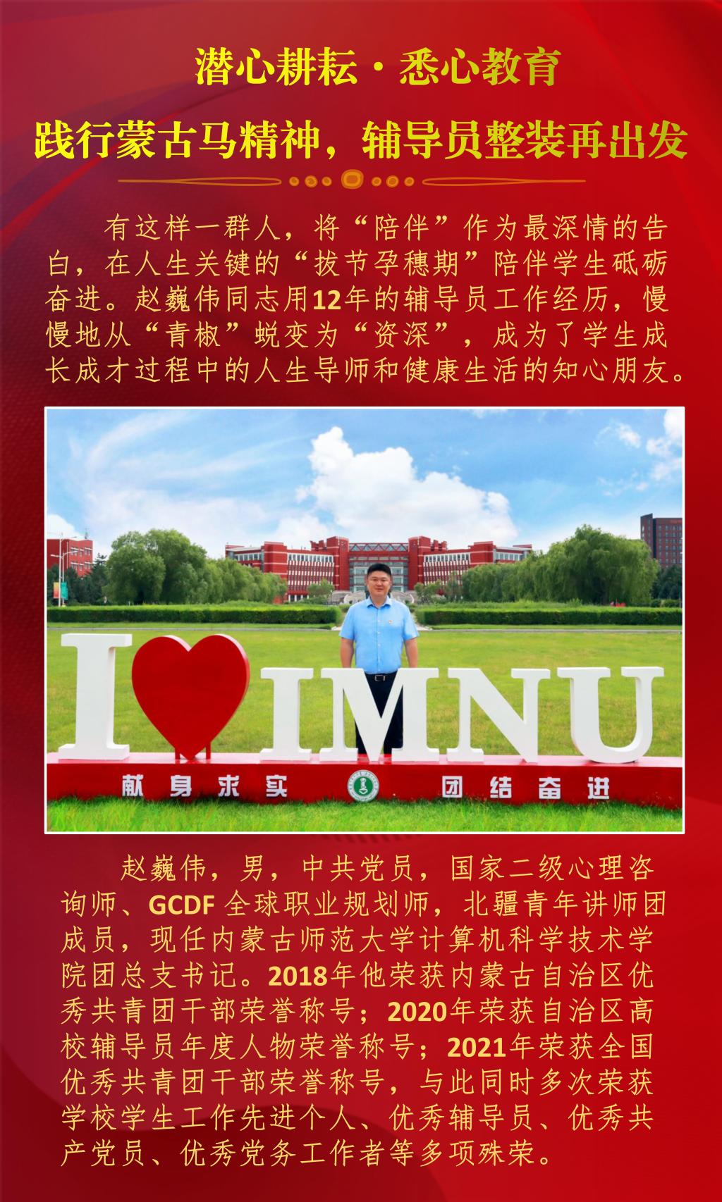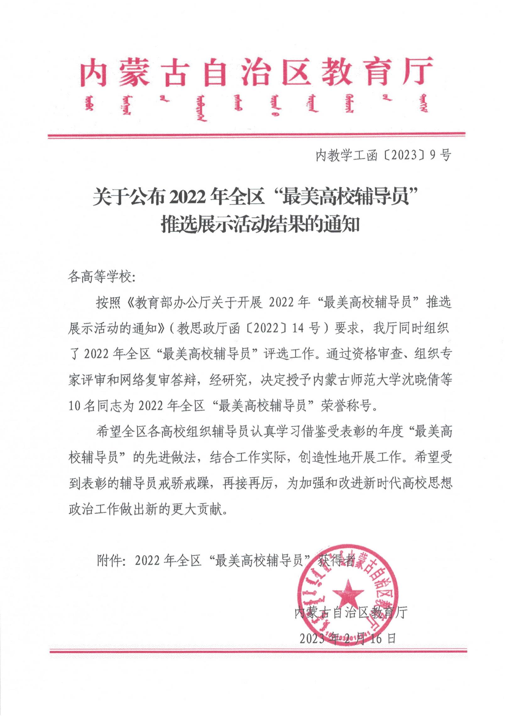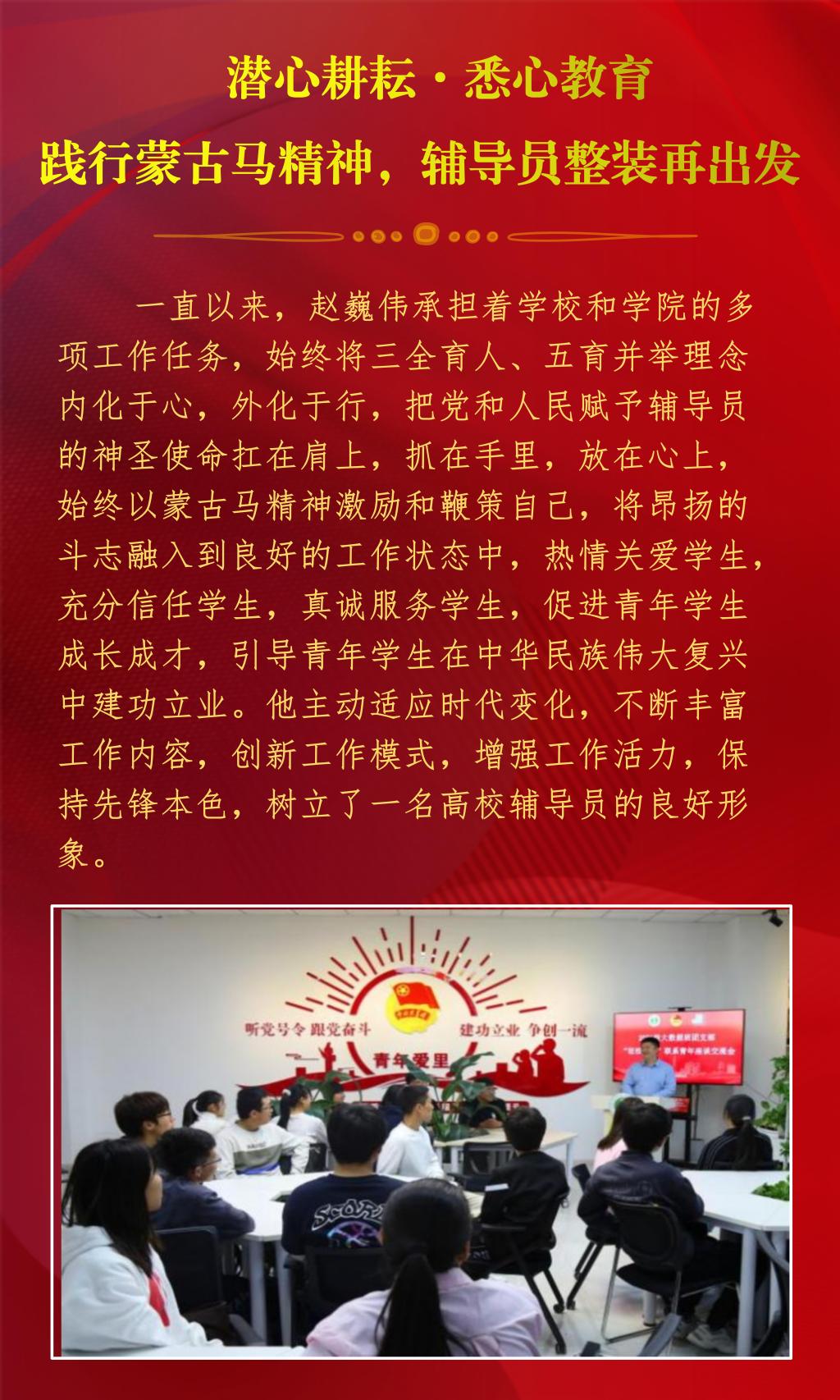 近日,内蒙古自治区教育厅公布了2022年全区最美高校辅导员推选展示活动的结果,经过资格审查、组织专家评审和网络复审答辩,授予10名辅导员“2022年全区最美高校辅导员荣誉称号”。必赢官网辅导员赵巍伟获此项荣誉。