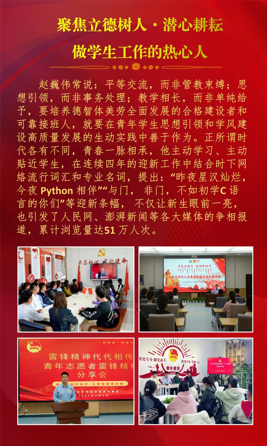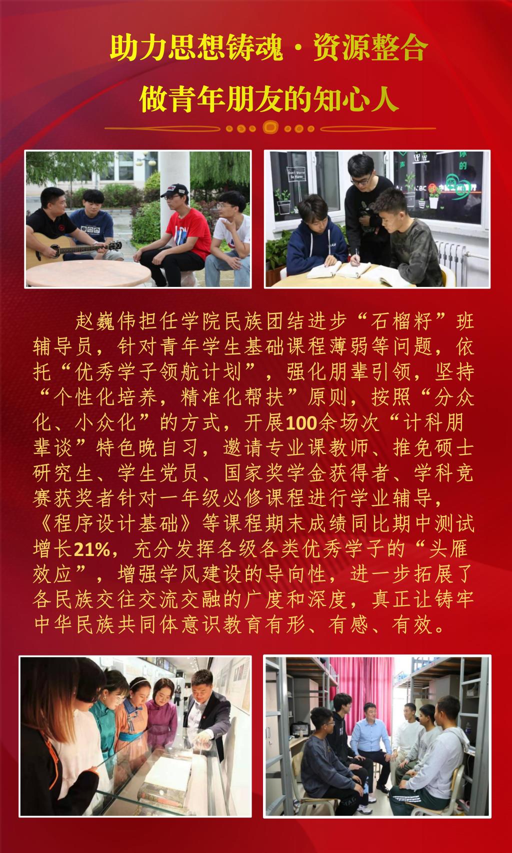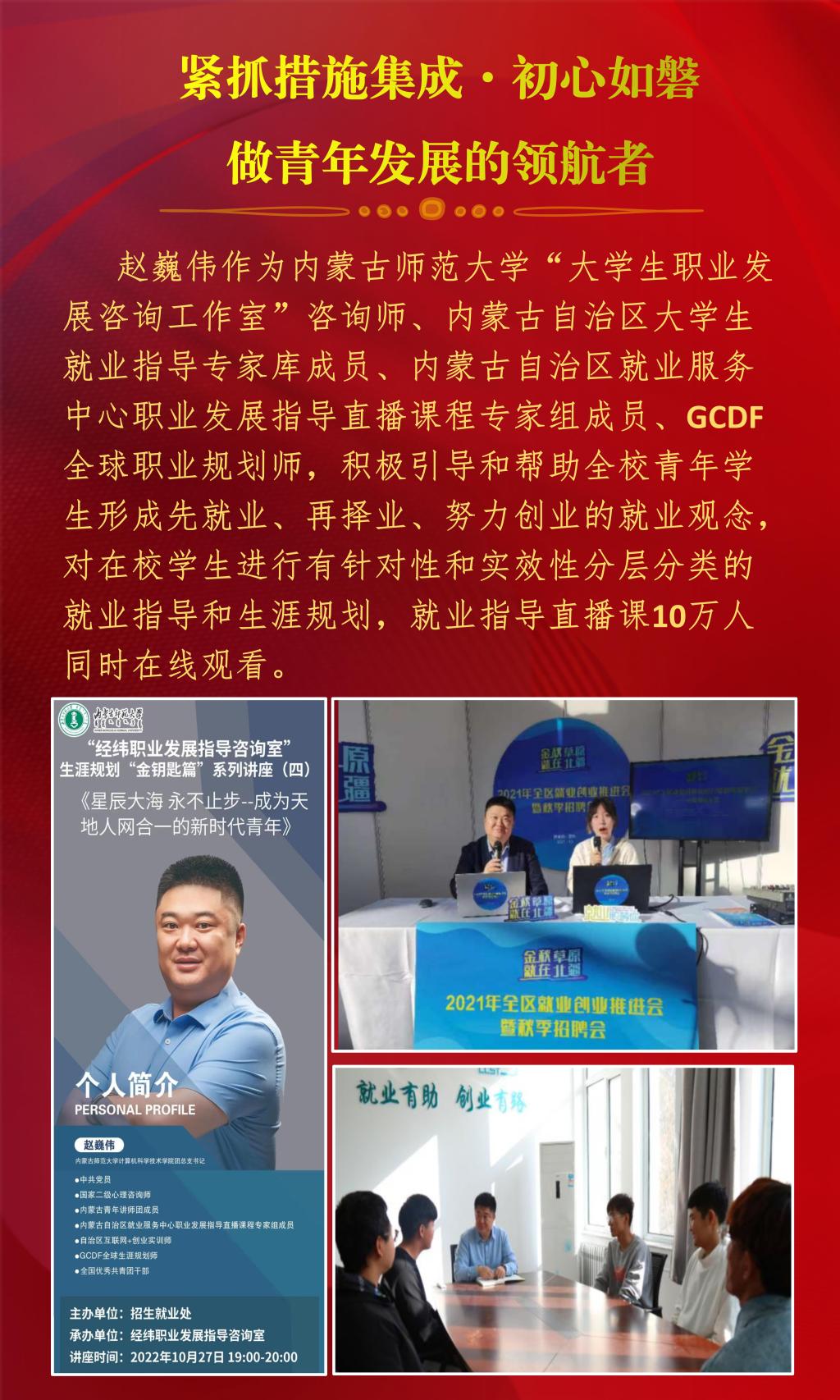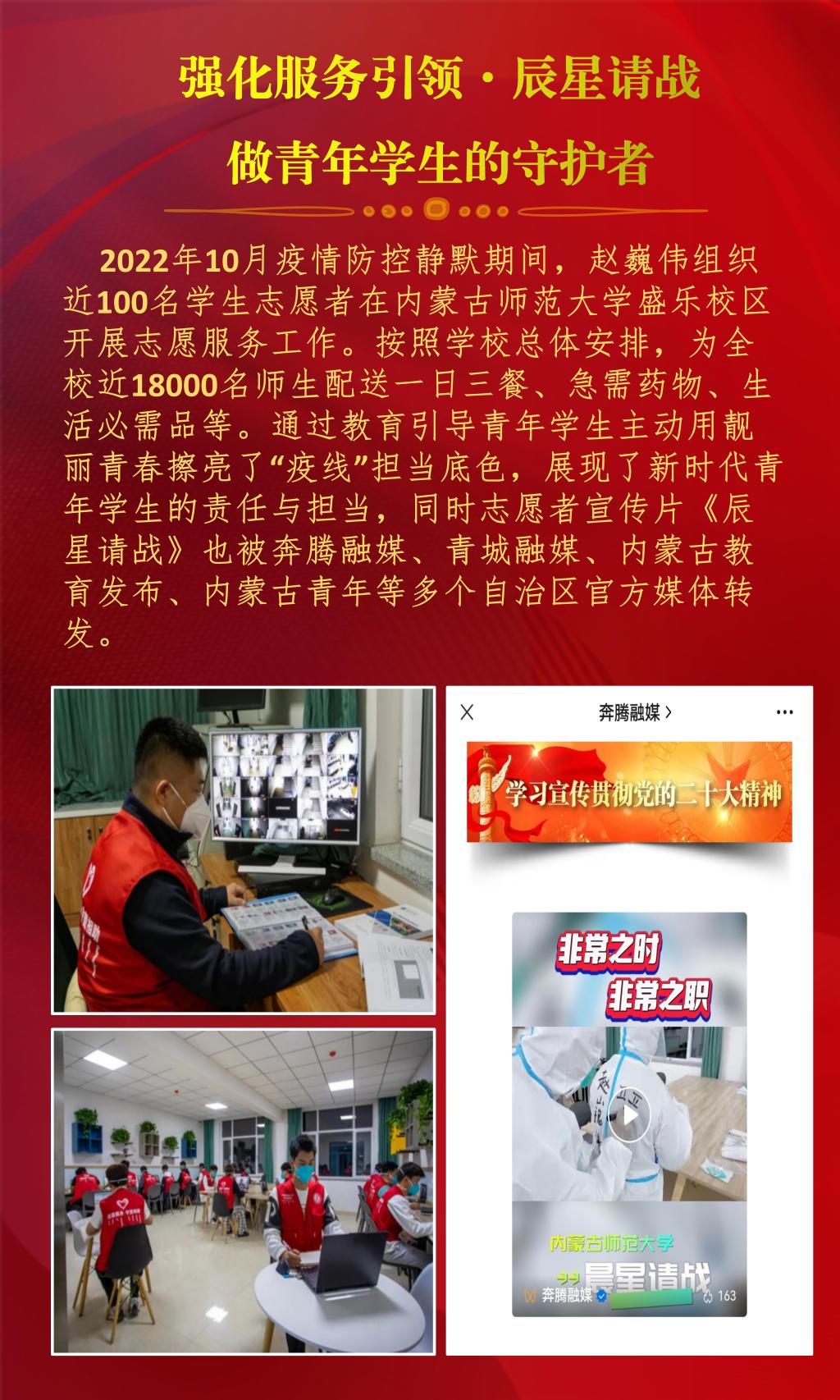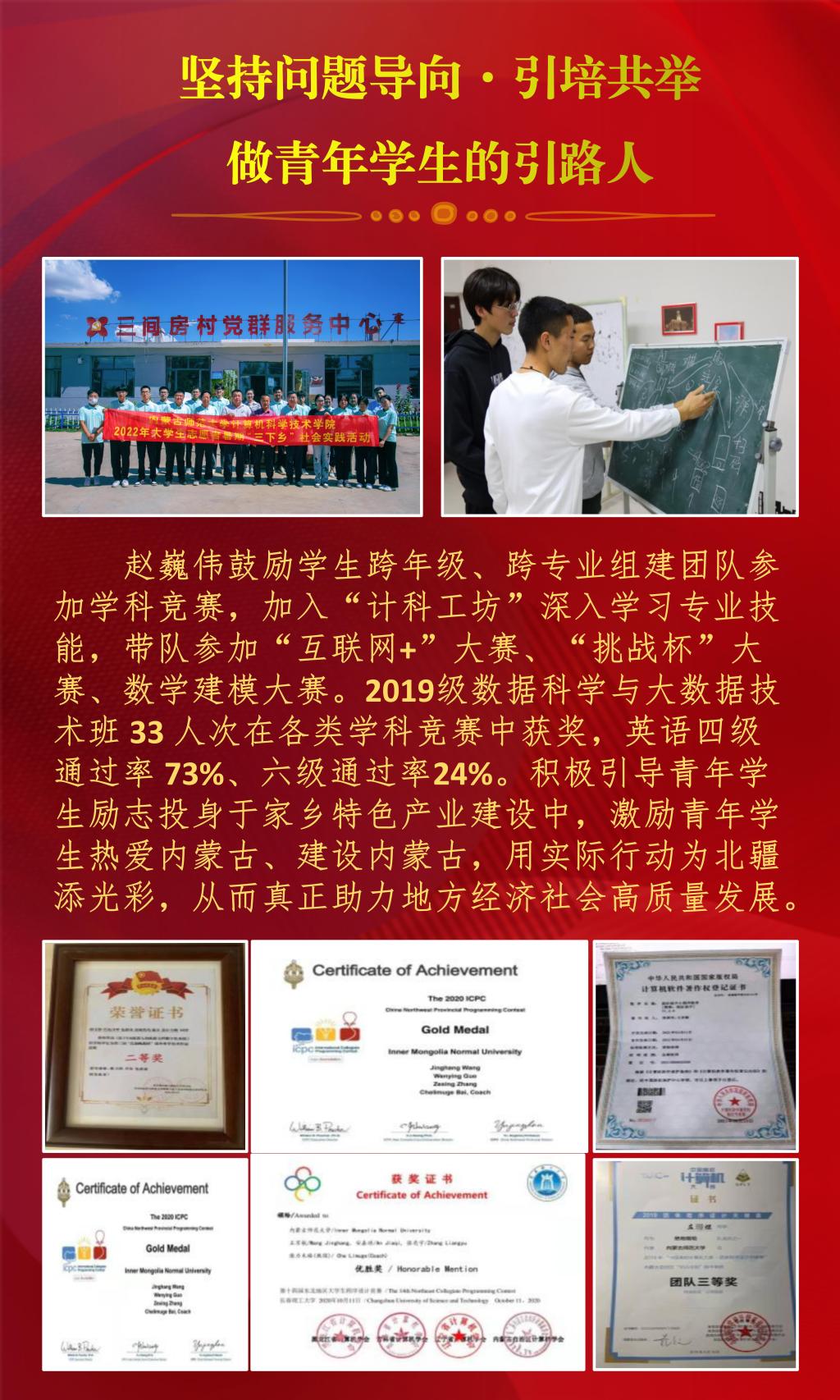 近日,内蒙古自治区教育厅公布了2022年全区最美高校辅导员推选展示活动的结果,经过资格审查、组织专家评审和网络复审答辩,授予10名辅导员“2022年全区最美高校辅导员荣誉称号”。必赢官网辅导员赵巍伟获此项荣誉。