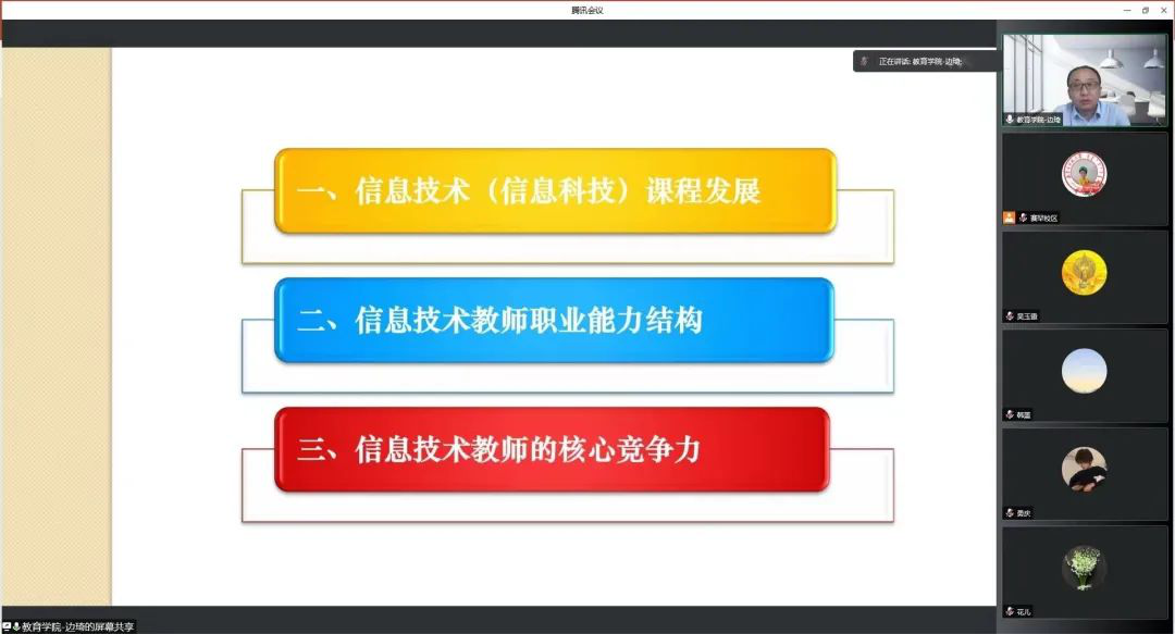 讲座中,边教授首先回顾了自1982年以来信息技术课程的发展历史。在此基础上,以现阶段中小学教学要求为导向,边教授分析了中小学校对信息技术教师的职业能力要求以及高校对计算机科学教育师范生的培养目标。最后,边教授重点讲解并与必赢官网“课程论”建设方向的教师深入探讨了关于如何提升信息技术教师核心竞争力的培养重点。本次讲座为必赢官网的师范生培养工作带来了很多思考与启发。