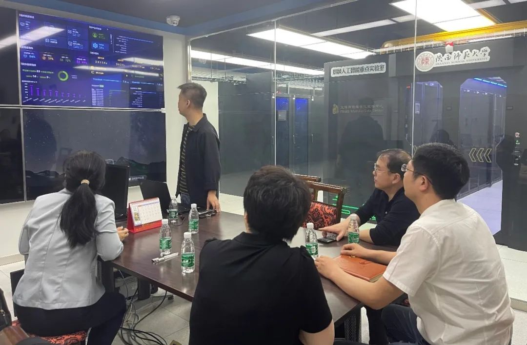 在陕西师范大学计算机科学学院,教学副院长李鹏介绍了学院的总体情况和学科建设情况。副书记郭康凌分享了学院近年来在学风建设和学生就业等方面的经验。双方就师范人才培养、实习实践、实验室建设、就业推动、智慧教育研究、项目合作等方面进行了深入探讨。之后一行三人随副院长李鹏到学院专业实验室进行参观学习。