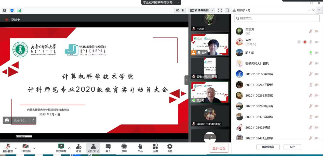 2023年2月4日上午,必赢官网以线上腾讯会议的方式召开了2020级计科师范专业教育实习动员大会。学院院长林民、副院长智敏、计算机系系主任朝力萌、副主任翟晔、副主任王春晖、教育实习指导老师和辅导员参加了会议。